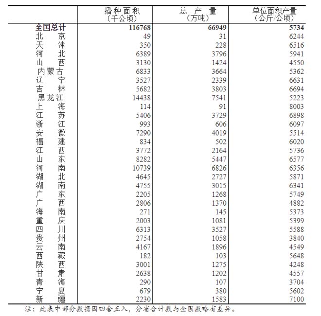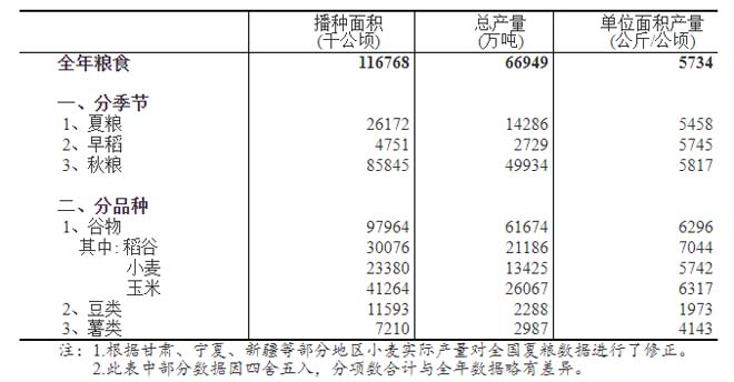 全國糧食總產(chǎn)量為31個(gè)?。▍^、市)夏糧、早稻和秋糧產(chǎn)量的總和。