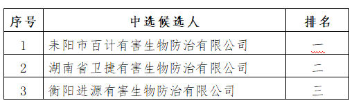 衡糧集團庫區白蟻防治服務(wù)項目(比選編號BX-015)于2025年10月20日下午14點(diǎn)30分進(jìn)行了比選活動(dòng)。經(jīng)評審小組綜合評審,現將中選候選人排名結果公示如下: